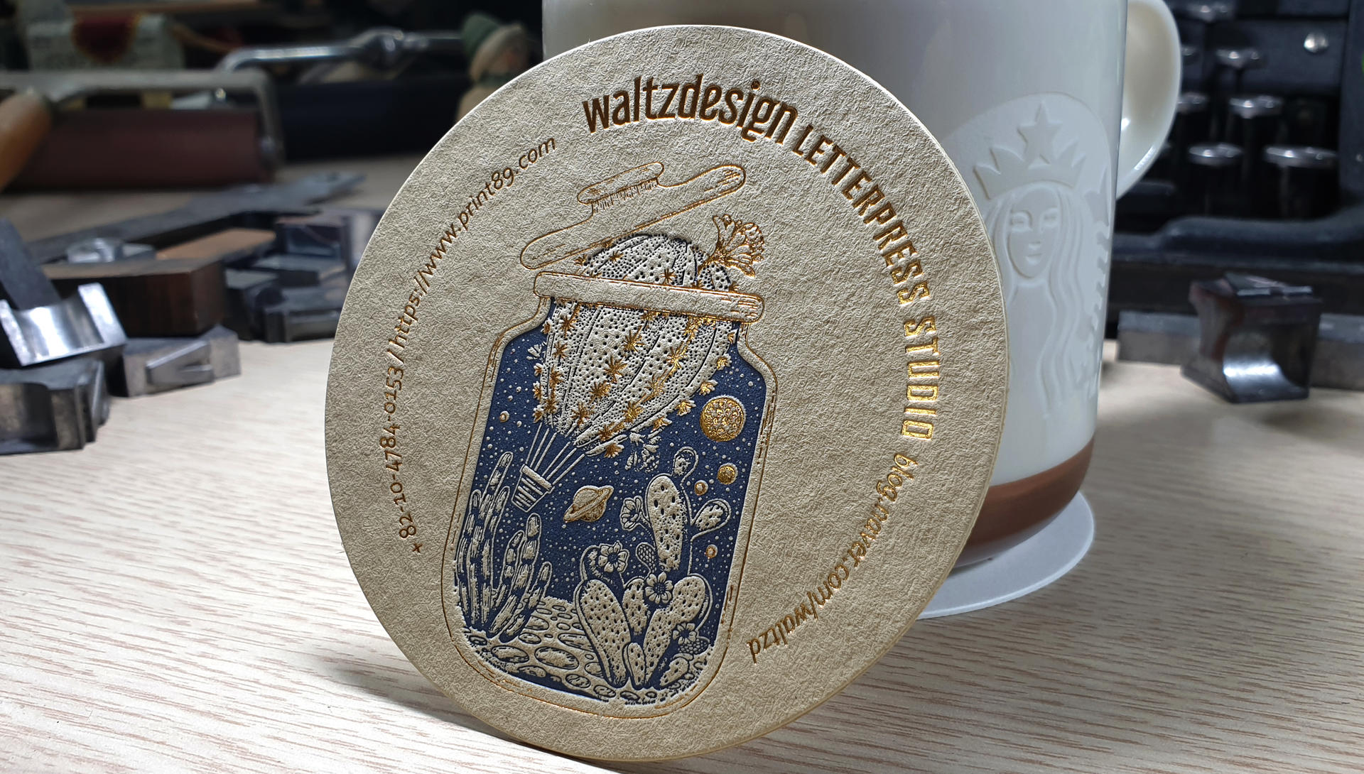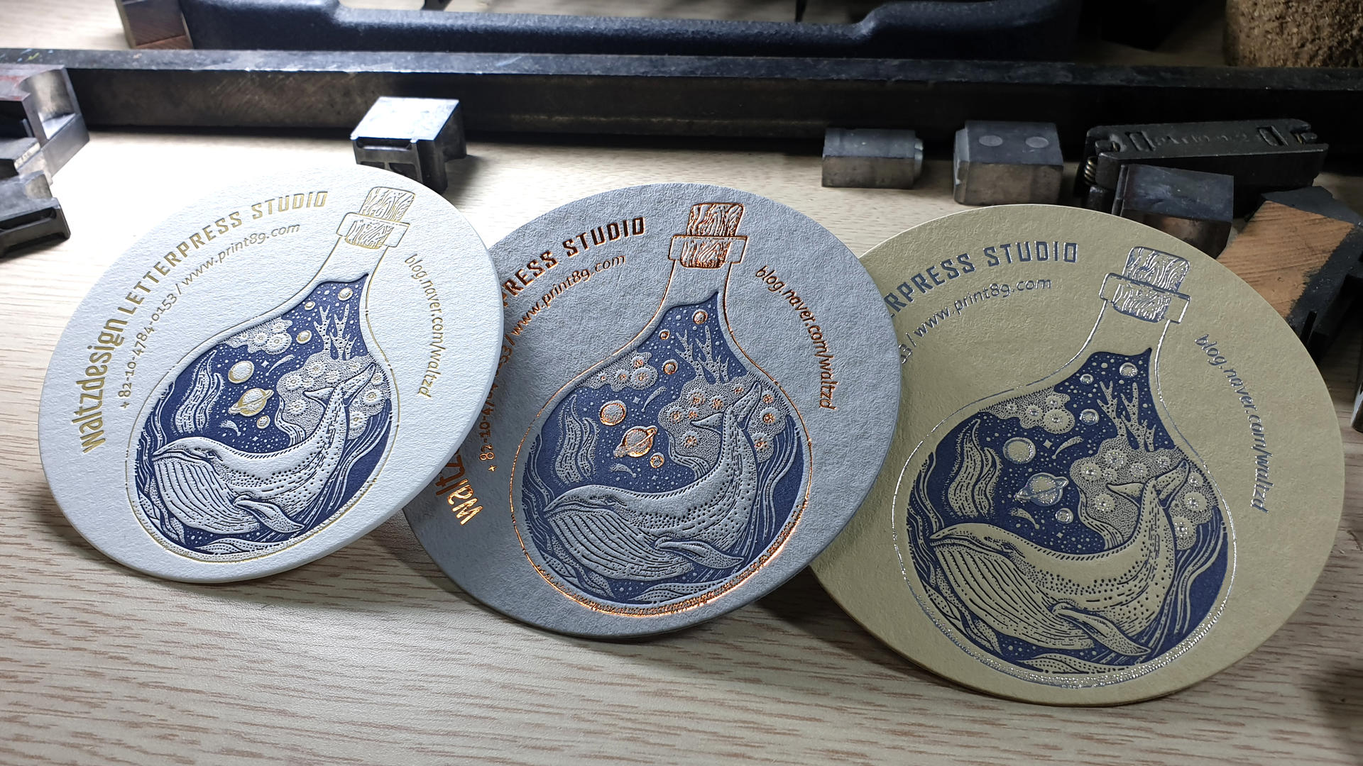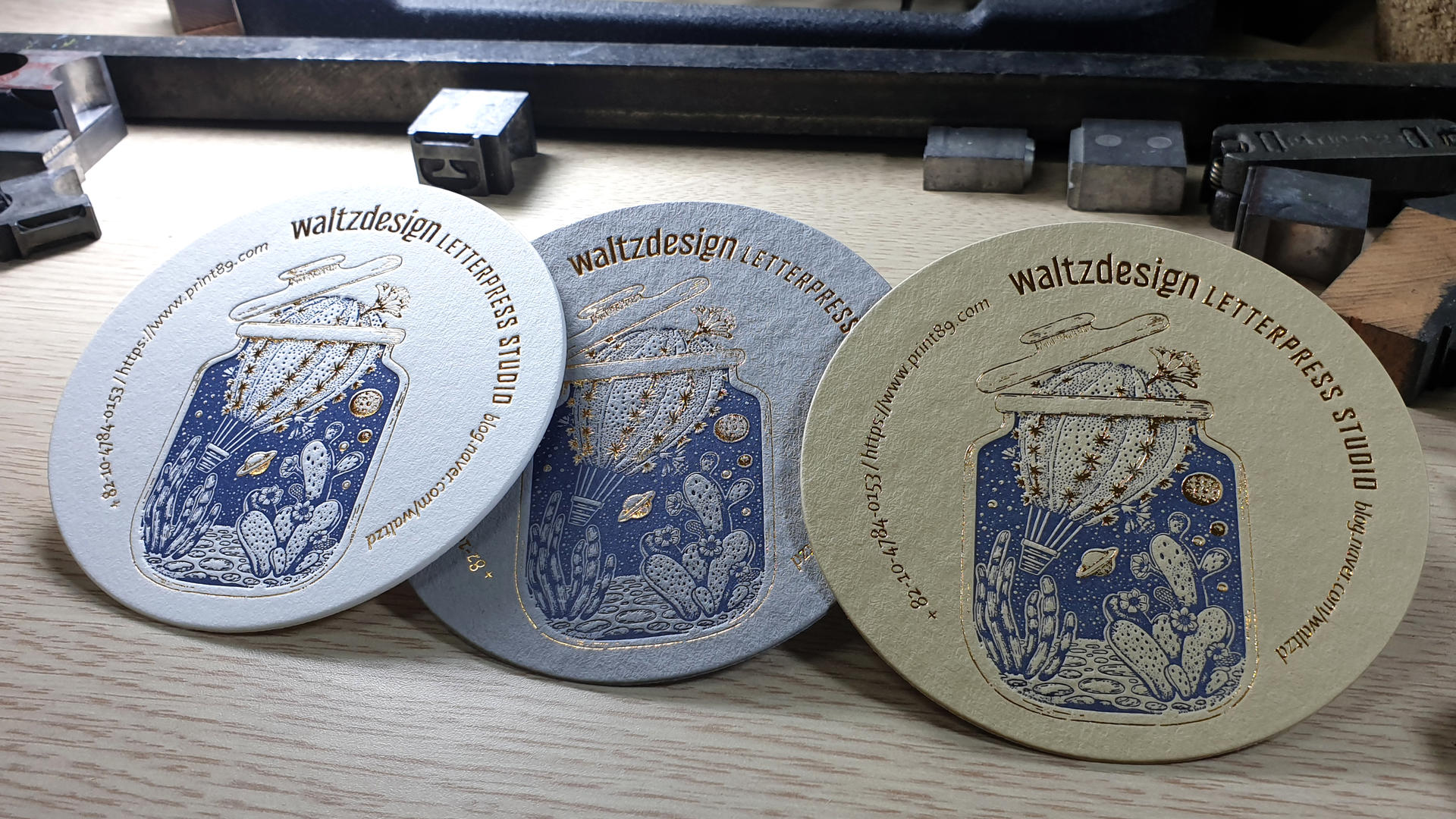 -위 사진은 그문드 하이디 크라프트 530g재질에 청색(별색) 레터프레스 인쇄 + 금박가공 처리한 형태입니다. -