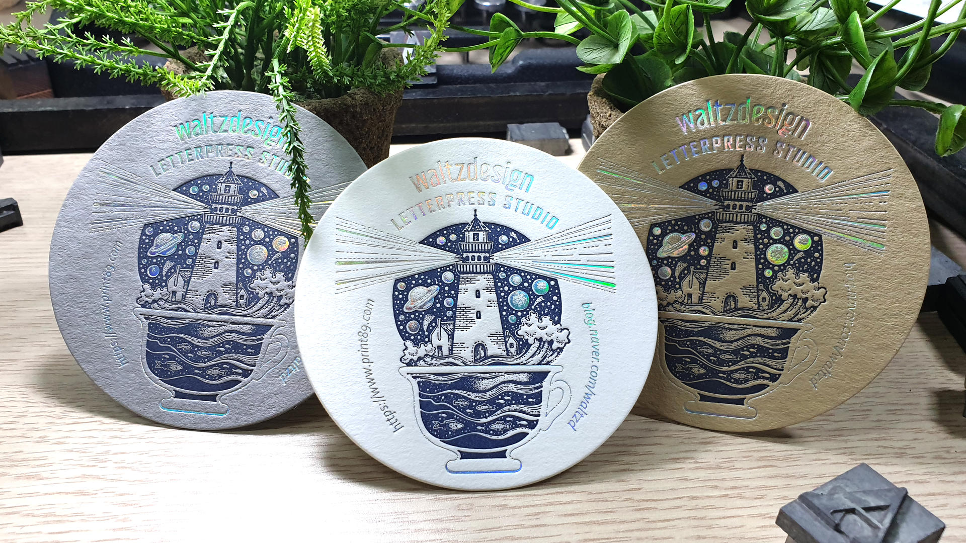 -위 사진은 그문드 하이디 그레이 530g재질에 청색(별색) 레터프레스 인쇄 + 동박가공 처리한 형태입니다. -